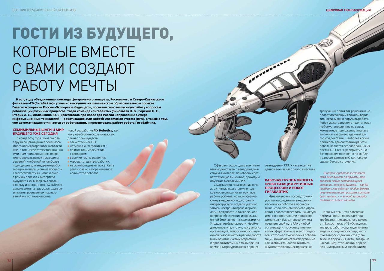 В 2019 году объединенная команда «ГБ (ГигаБайты)» успешно роботизировала процессы Главгосэкспертизы РФ в рамках проекта «Экспертиза будущего». Осенью 2021 года коллеги написали о сотрудничестве с нами в корпоративном издании «Вестник государственной экспертизы».