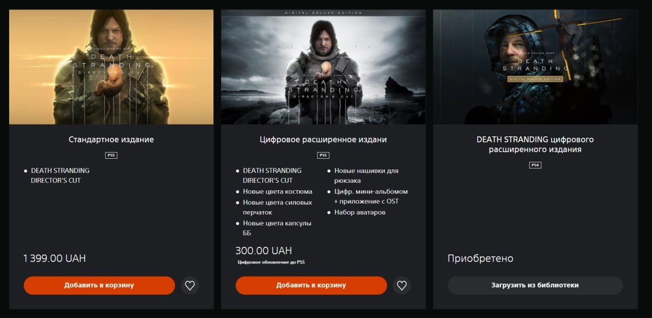 Відбувся реліз розширеного видання Death Stranding. Ексклюзивно на PlayStation 5. Базова версія видання коштує 1399 грн, Delux — 1699. Власники PS4-версії гри можуть оновитися до Death Stranding DIRECTOR’S CUT Delux-видання за 300 грн.