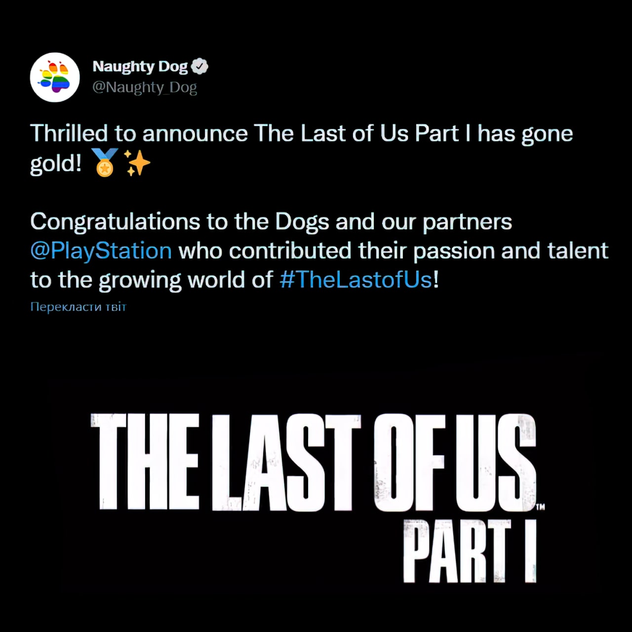 "З радістю повідомляємо, що The Last of Us Part I пішла на золото! Вітаємо усіх працівників студії і наших партнерів з PlayStation, які внесли свою пристрасть і талант у зростаючий світ The Last of Us!"