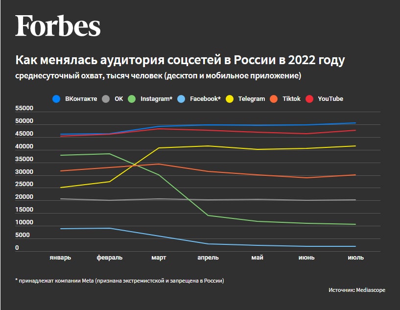 Forbes опубликовал исследования Mediascope об изменении количества пользователей соцсетей в 2022 году. Даже людей с VPN использовали. Из интересного три вещи: