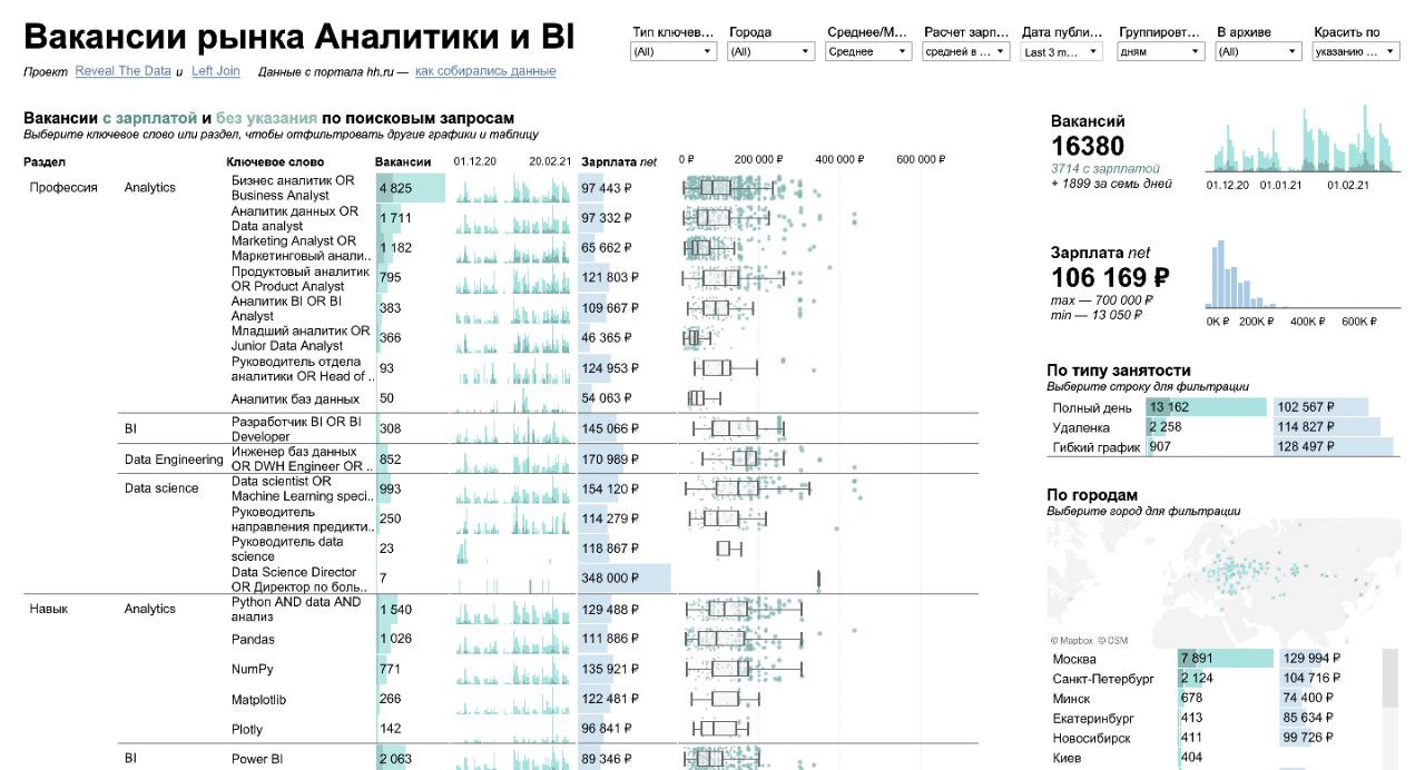 Анализ рынка вакансий Аналитики и BI. Автоматически обновляемый дашборд, который позволяет следить за рынком вакансий по аналитики и BI. Этот инструмент доступен всем желающим и они могут понять на какую зарплату могут рассчитывать в своём регионе или знают какой-то инструмент. Можно понять как средние значения зарплат, так и динамику по количеству предложений или подобрать конкретные вакансии.
