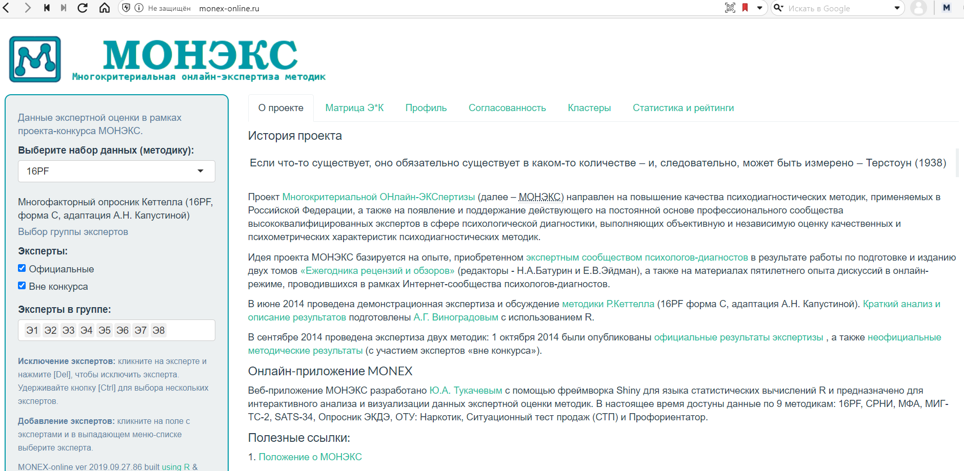 Проект Многокритериальной ОНлайн-ЭКСпертизы (МОНЭКС) направлен на повышение качества психодиагностических методик, применяемых в Российской Федерации, а также на появление и поддержание действующего на постоянной основе профессионального сообщества высококвалифицированных экспертов в сфере психологической диагностики, выполняющих объективную и независимую оценку качественных и психометрических характеристик психодиагностических методик. В том числе методик, используемых в рамках #оценка_персонала организаций.