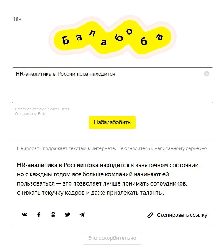 #нейросети #ИИ #ML Устами младенца ... то есть нейросети. "Яндекс" запустил "Балабобу" — сервис с помощью нейросетей дописывает любой текст и работает на основе языковой модели YaLM . Решил протестировать, введя фразу "HR-аналитика в России пока находится...". Результат очень похож на правду :)