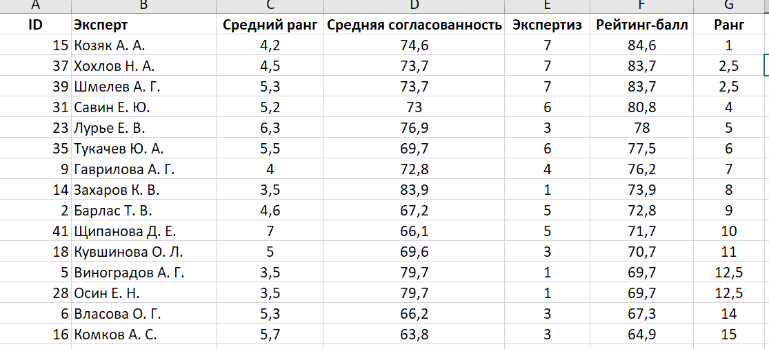 #МОНЭКС В проекте МОНЭКС (http://monex-online.ru) у нас не только методики получают какой-то свой интегральный рейтинг-балл по 20 критериям. Есть еще рейтинг экспертов. 15 лучших экспертов из 70 (по результатам всех экспертиз): Средний ранг -- усредненное значение результативности (места) эксперта по всем экспертизам; Средняя согласованность -- усредненное значение согласованности эксперта по всем экспертизам; Рейтинг-балл -- итоговый балл эксперта с учетом активности в экспертизах; Ранг -- место эксперта в рейтинге в зависимости от рейтинг-балла.