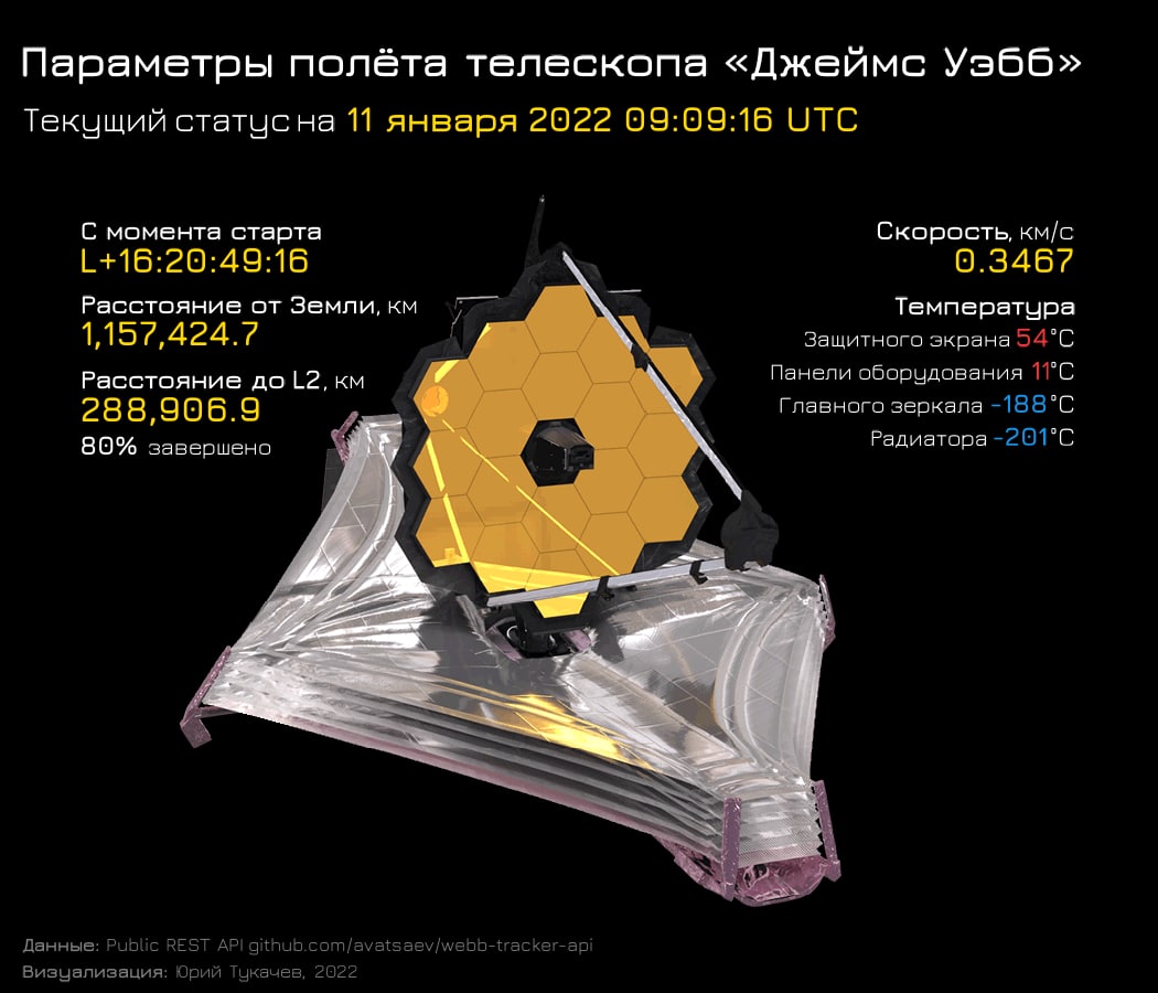 25 декабря 2021 года с космодрома Куру во Французской Гвиане стартовала ракета-носитель Ariane 5, которая вывела в космос телескоп "Джеймс Уэбб" стоимостью 10 миллиардов долларов -- самая сложная и дорогая космическая обсерватория в истории (для справки: это около 27% годового бюджета Москвы). В удивительное время мы живём. Запуск можно было смотреть в прямом эфире, а 29 декабря NASA открыло для всех доступ к текущим усредненным показаниям с 4 датчиков температуры на горячей и холодной сторонах телескопа, данным о параметрах полёта телескопа: крейсерской скорости, расстоянии от Земли, расстоянии до конечной точки L2. Если есть данные, то можно пробовать их собирать и визуализировать. Я написал простой скрипт на R, который скачивает данные о текущем статусе телескопа с помощью открытого публичного неофициального API и визуализирует основные метрики на мини-дашборде в виде статичной картинки или обновляемой картинки в приложении на shiny (для обновления показателей нажмите F5 на ПК).