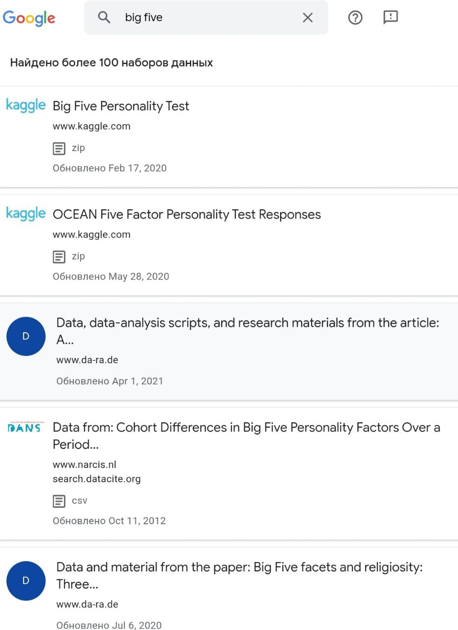 Давайте попробуем поискать датасеты с ключевым словом "big five":