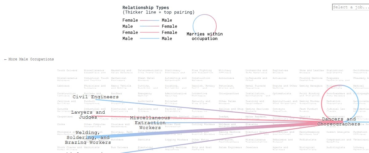 #профессии #14февраля Агенство Bloomberg проанализировало связь между профессией супругов на основании данных Бюро переписи населения США за 2014 год (3,5 млн. домохозяйств) и опубликовали интересную интерактивную инфографику. Для любой выбранной профессии на диаграмме выделены пять наиболее частых совпадений профессий. Например, мужчины-пожарные чаще всего женятся на медсестрах, а женщины-медсестры чаще всего выходят замуж за менеджеров ) Менеджеры по продаже оборудования женятся на школьных учительницах, а психологи создают семьи с психологами. Метод предоставления данных просто отличный. И да, танцовщицы в конечном счёте выходят замуж за сварщиков 😊 Мораль: "все профессии важны, а все пары — хороши".