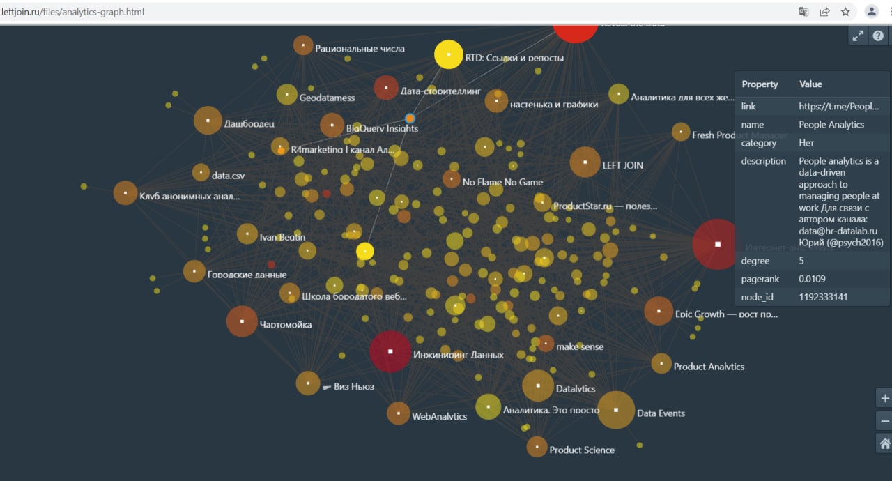 Авторы самых разных блогов в телеграме часто публикуют подборки любимых каналов, которыми они хотят поделиться со своей аудиторией. Николай Валиотти (канал Left Join) и Андрей (канал Это разве аналитика?) составили рейтинг интересных аналитических телеграм-блогов, визуально представленного в виде графа.