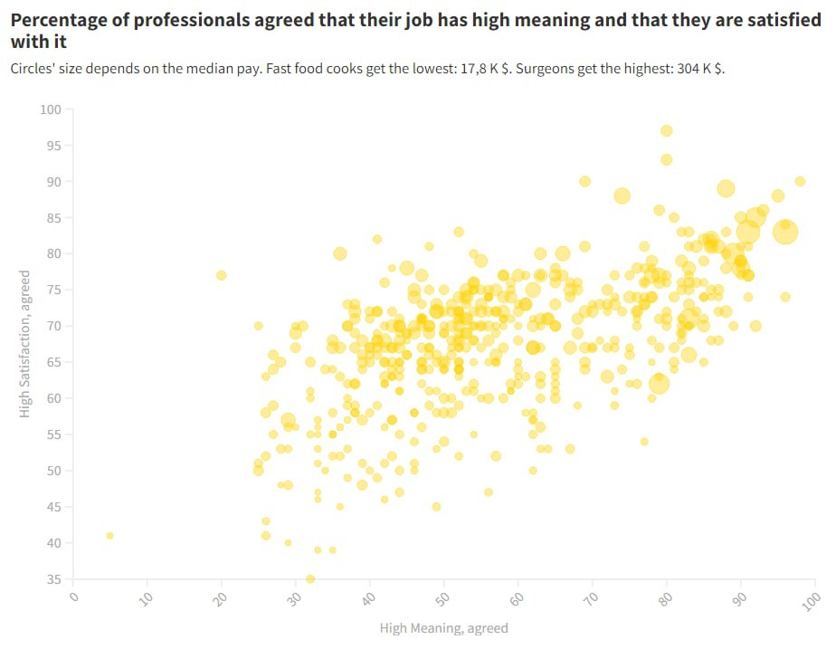 ❶ Визуализация на Flourish Удовольствие от работы: где работают счастливчики, которые кайфуют от своей работы и считают её важной? (английский) | Источник: Call me data
