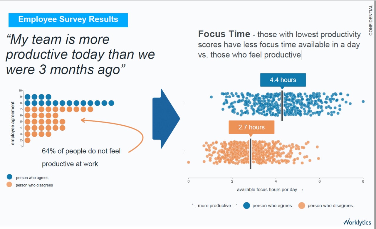 Исследование Worklytics как раз посвящено тому, сколько времени есть у сотрудников для выполнения важной работы и как они оценивают свою производительность. Так, сотрудники, которые сообщали о более высокой продуктивности, могли фокусироваться на задачах в течение дня в среднем 4.4 часа, в сравнении с теми, кто не чувствовал себя продуктивным, поскольку могли сосредоточиться на выполнении задач в среднем только 2.7 часа в день.