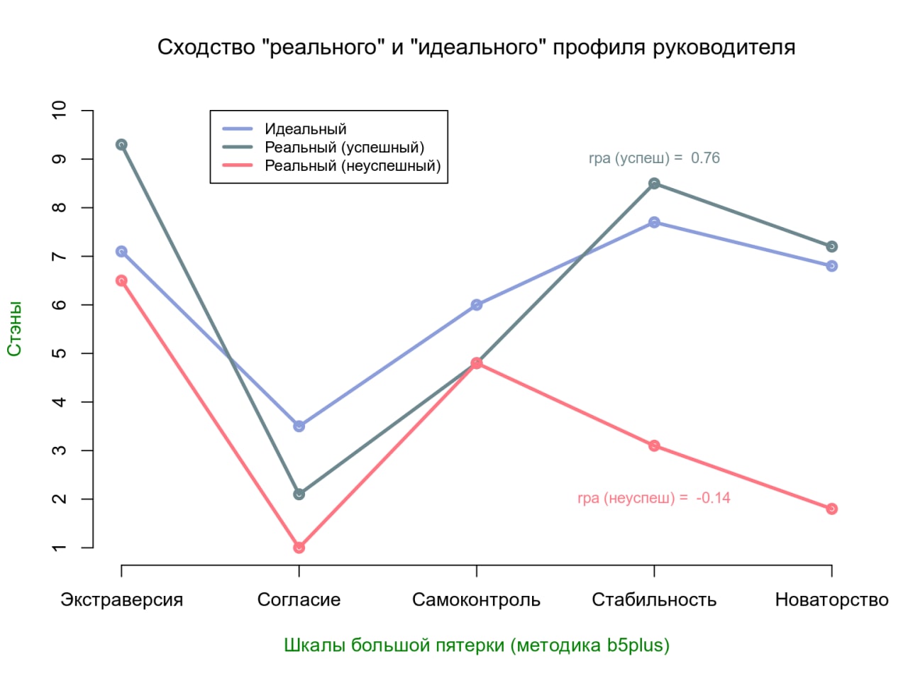 Пробуем посчитать коэффициент сходства профилей МакКрэя rpa (см. McCrae RR. A note on some measures of profile agreement. J Pers Assess. 2008 Mar;90(2):105-9. doi: 10.1080/00223890701845104) на реальных данных. Идеальный профиль руководителя — "усредненный" результат по личностному опроснику B5plus, полученный на выборке успешных руководителей. Рассматриваем реальный профиль одного успешного руководителя, который добился существенных изменений в эффективности подразделения за очень короткий срок после своего назначения, а также сравниваем его с идеальным профилем (группой успешных руководителей) и профилем неуспешного руководителя, у которого ниже уровень эффективности и существуют проблемы в подразделении.
