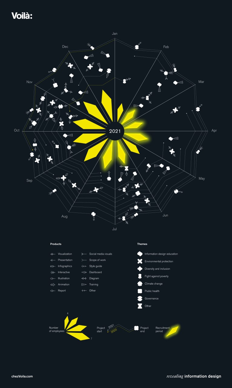 ❶ 📈 Объявлены победители Information is Beautiful Awards 2022. В номинации «Бизнес-аналитика» золото получила неоднозначная работа The star of our work (см. картинку к посту). Странно видеть дата-арт о работе команды в виде «паутины» проектов и изменение числа сотрудников в центре визуализации. Как вам? При этом работа в виде классического HR-дашборда от Pradeep Kumar, о котором я писал летом, получила лишь бронзу ☹️ 🤯