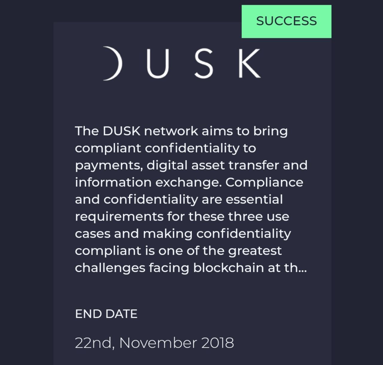 Речь идёт о проекте Dusk Network, закрывший на платформе Ethfinex более 1 мил. дол в ноябре 2018 года🤗