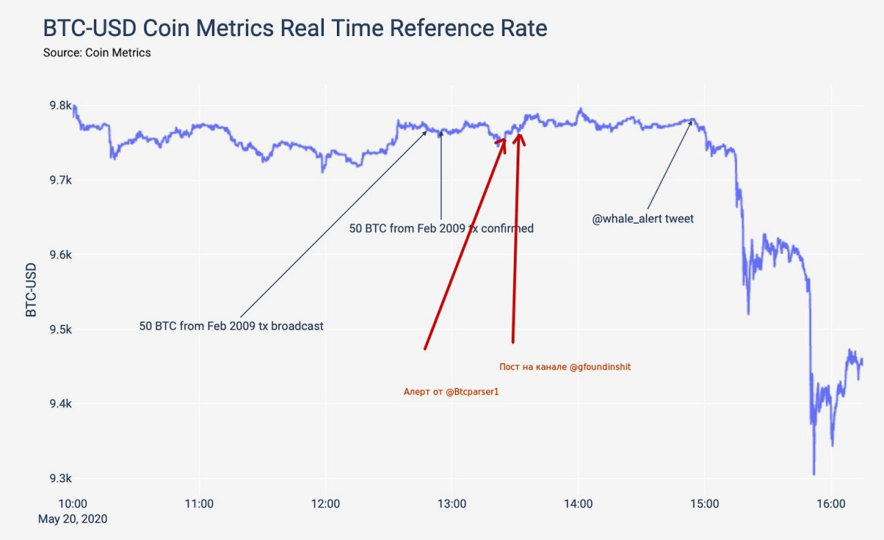 Позволю себе внести несколько, как мне кажется необходимых, добавлений в таймлайн от Coinmetrics ценовой реакции на перемещение 50 BTC из 2009 года