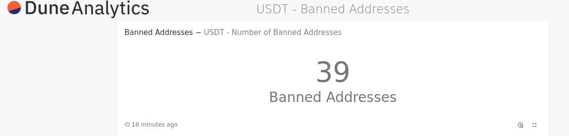 Сформированный запрос в платформе Dune Analytics показывающий количество заблокированных адресов в USDT - ERC-20. На данный момент их 39, но платформа при обновлении запроса покажет новые заблокированные адреса (если они появятся)