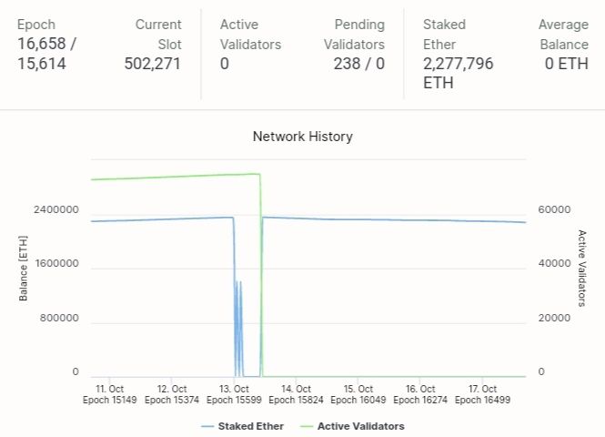Если судить по обозревателю Medalla, сеть остановилась пару часов назад на слоте 502 271, и на теперешний момент там ноль активных валидаторов.