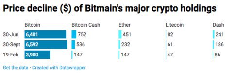 Bitmain хранит преимущественно биткоин, Bitcoin Cash, Ethereum, Litecoin. Процентное соотношение этих активов в портфеле компании неизвестно. Однако, исходя из таблицы ниже, можно представить насколько глубоким могло быть снижение стоимости криптопортфеля китайской компании:Тем не менее, невзирая на сокращение численности персонала, закрытие офисов и снижение доли на рынке, компания продолжает развиваться. Так, на днях Bitmain представила 7-нанометровый ASIC-чип, который почти на треть энергоэффективнее прошлой версии. Компания планирует задействовать эти чипы в устройствах S17 и T17, релиз которых состоится в ближайшее время. Динамика цен криптовалют в портфеле Bitmain за период с 30 июня 2018 года по 19 февраля 2019