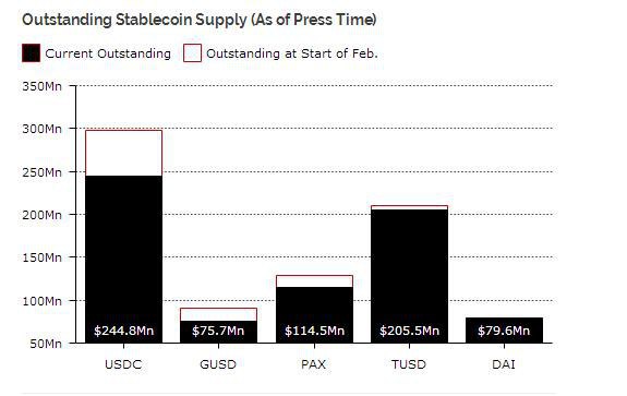 Наибольшие потери в первой половине февраля понес токен USDC, чья капитализация просела с $297,8 млн до $244,8 млн. Стоимость токенов GUSD сократилась до $75,7 млн, а PAX – до $114,5 млн. Капитализации TrueUSD (ТUSD) снизилась незначительно, и на момент публикации отчета она составляла чуть более $205 млн (сейчас стоимость токенов достигла $210 млн).