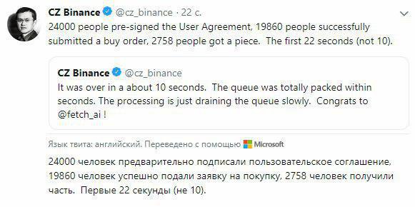 Сначал глава Binance Чанпэн Чжао написал, что IEO прошло за 10 секунд. Однако чуть позже он уточнил, что токенсейл продлился 22 секунды. По его словам, почти 20 000 человек разместили ордера на покупку, но лишь 2758 участникам удалось купить токены. Цена токена одного токена FET составляла 0.008584 BNB (около $0.08