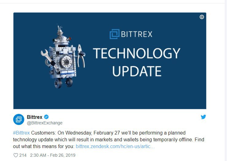 Криптовалютная биржа Bittrex анонсировала обновление программного обеспечения 27 февраля 2019 года, в связи с чем торговая площадка временно приостановит обслуживание трейдеров.