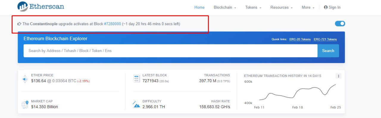 🔥ETH Fork Constantinople🔥 Время добычи блока и всю инфо по Эфиру смотрю здесь https://etherscan.io/?utm_campaign=newsletter&utm_source=newsletter&utm_medium=email