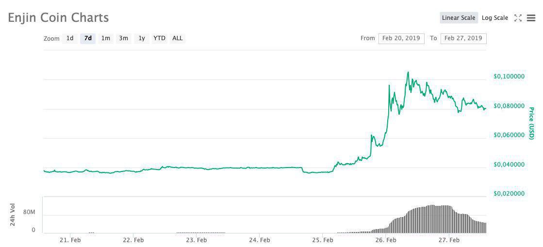 Недельный график Enjin. Это та самая монетка, которая засветилась в новостях из-за поддержки на линейке Galaxy S10.