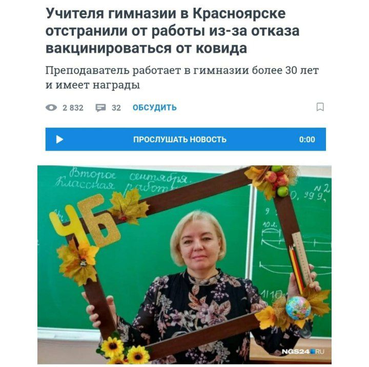 ⛔️ В гимназии № 8 Красноярска учителя начальных классов Оксану Торопову отстранили от работы из-за отказа вакцинироваться против коронавируса. Об этом она сама сегодня рассказала NGS24.RU. Женщина работает в гимназии на Менжинского с момента окончания вуза - в течение 32 лет.