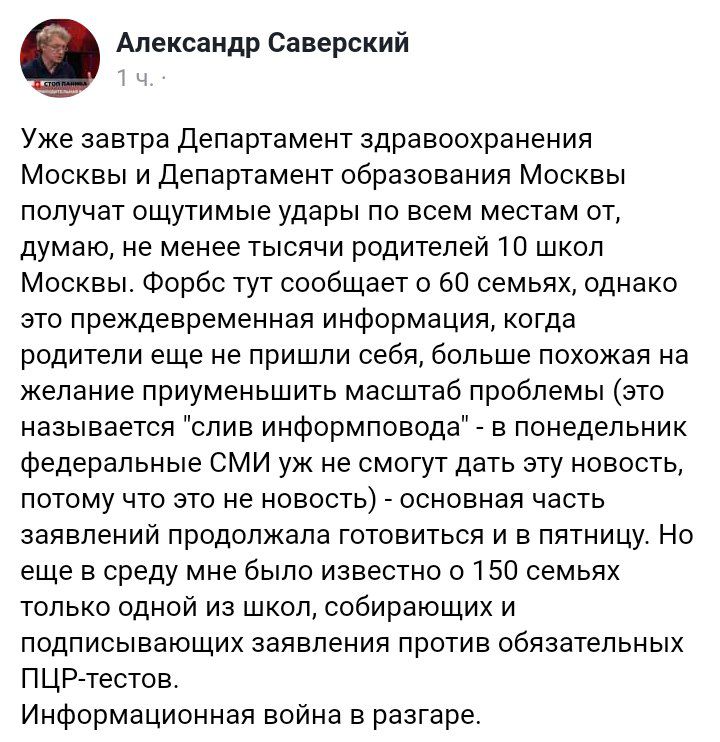 Интересное мнение на происходящее: "А почему никто не задумался о том, что под видом тестирования детей и, кстати не только детей, может быть проведена массовая факцинация факциной, которая вводится не внутримышечно, а орально или назально?