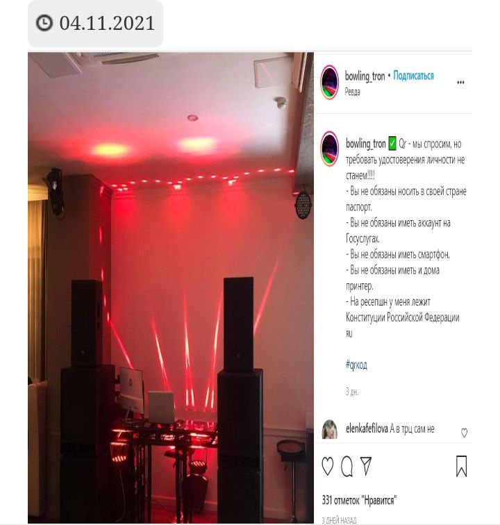Предприниматель Евгений Жуков опубликовал пост на своей странице в сети Instagram, в котором он написал, что не может заставить клиентов предъявлять QR-коды и паспорта.