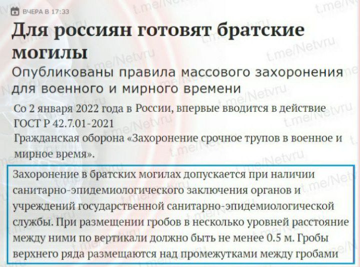 "Захоронение в братских могилах допускается при наличии санитарно-эпидемиологического заключения органов и учреждений государственной санитарно-эпидемиологической службы. При размещении гробов в несколько уровней расстояние между ними по вертикали должно быть не менее 0.5 м. Гробы верхнего ряда размещаются над промежутками между гробами нижнего рода."