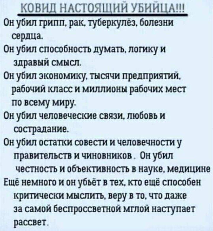 Людей всеми силами отвлекают от того, что происходит в Канаде и в Австралии, скрывают информацию или врут, дезинформируют. И всё это делают те же, кто врёт нам все эти два года о страшной, невиданной медицинской опасности, кто врал десятки лет о страшной террористической опасности, о страшной климатической опасности, о всевозможных других опасностях... Это - те, кто придумывают и создают все эти опасности, а главное, стараются ВНУШИТЬ людям, что эти опасности существуют, чтобы на них зарабатывать и чтобы порабощать запуганных людей, ничего, кроме прибыли и порабощения, их не интересует. И поэтому они придумывают и будут придумывать всё новые страшилки. Людям нужно просто понять, что главная и, по сути, единственная опасность и угроза исходит от тех, кто постоянно пугает людей, натравливает их друг на друга, постоянно врёт им о мире и о них самих, распространяя дезинформацию через продажные СМИ, продажных политиков и продажных "учёных". В чём одна из важнейших особенностей канадских событий? В том, что люди выступили не только против безумных, психопатических и садистских ограничений, не только против искусственно создаваемого "спасателями природы" надвигающегося экономического коллапса, но, прежде всего, против ЛЖИ, которую потоками выливает на них преступная власть. Именно ложь, дезинформация, и те, кто ее распространяет - психопаты, пытающиеся обмануть и запугать всё человечество, - и являются теми, с кем необходимо вести бескомпромиссную борьбу, борьбу до победы.