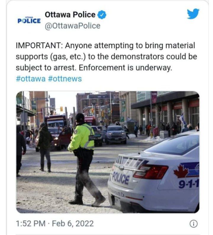Двое фермеров, участвовавших в акции протеста дальнобойщиков в Оттаве, арестованы за то, что в их грузовике были пустые баки. Их грузовик конфискован и отбуксирован компанией Ottawa Metro Towing. Я думаю, что не ВСЕ буксировочные компании на нашей стороне. Это настолько тоталитарно, что с трудом верится. Они арестовывают людей за наличие емкостей с горючим.