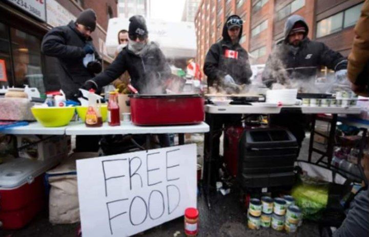 Во втором видео люди идут передавать топливо протестующим водителям грузовиков. Правительство Канады угрожало судебными преследованиями тем, кто будет помогать протестующим, но, похоже, это не сработало.