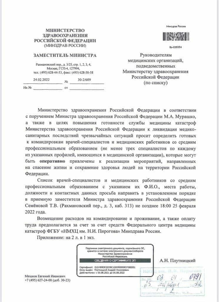 В подписанном в пятницу письме замминистра Плутницкий потребовал от всех российских главврачей сформировать списки медиков, которые по команде смогут отправиться в командировки для «спасения жизней и сохранение здоровья людей на территории РФ».