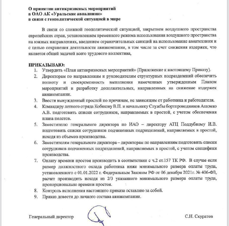 Сотрудникам будут оплачивать время простоя. Перевозчик назвал такие меры вынужденными. Целью антикризисного плана стало сохранение работы компании, в том числе за счет снижения издержек. Проблемы возникли из-за геополитической ситуации, закрытия неба европейских стран, а также санкций на использование авиатехники.