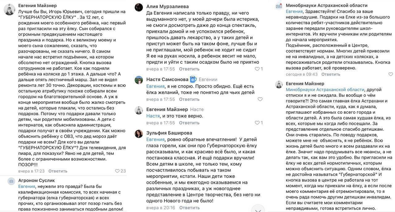 — Мой ребёнок ждал подарок на Новый год, он шёл на ёлку к Деду Морозу и ничего не получил. Я расстроена всей организацией праздника — ужасные декорации, помещения. Это главная елка в Астрахани, да у нас в ТЦ лучше ёлки стоят. А здесь на костюмы смотреть страшно, жалко прям. Но детишки старались, прекрасно выступили. Хотя осадок остался ужасный. А то, что пишет местный Минобр — курам на смех.