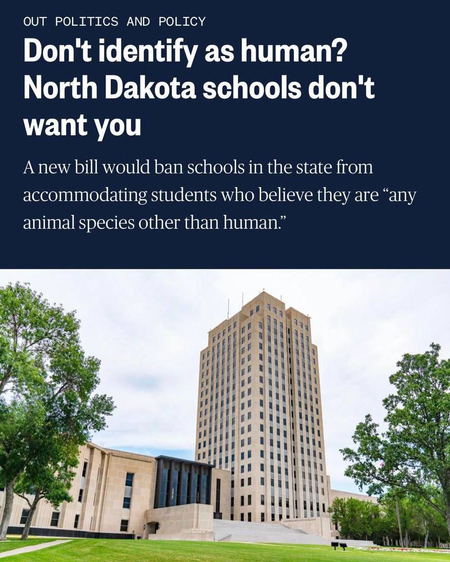 «Новый законопроект запретит школам принимать учеников, которые считают себя «любым видом животных, отличным от человека». Законопроект направлен на то, чтобы запретить школам обучать трансгендерную молодежь, и включает подраздел, предназначенный и для другой категории учащихся. Представитель заксобрания Лори Ванвинкл пояснила, что в штате действительно есть ученики, которые не считают себя людьми: «Да, у нас есть те, кто хотел бы заявить о себе как о животных, таких как кошки и собаки». Если законопроект будет принят, то учителям также будет запрещено использовать «предпочтительные гендерные местоимения учащихся», если они не соответствуют полу при рождении. Согласно законопроекту, школы, уличенные в нарушении этой политики, могут быть оштрафованы на сумму до 500 000 долларов»