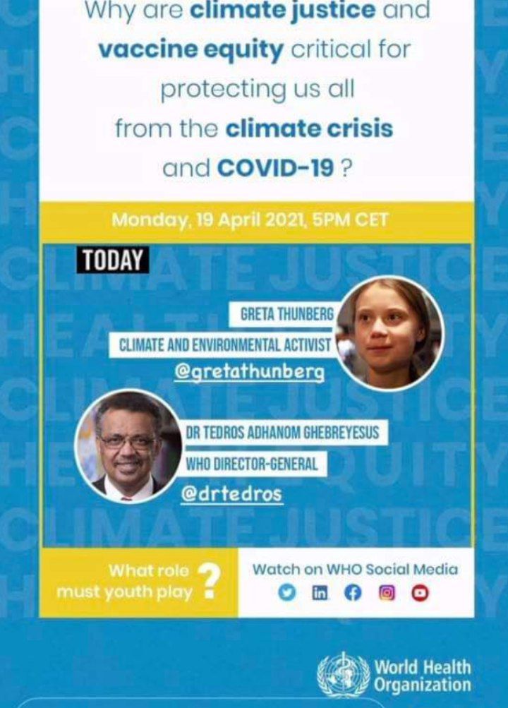 Итак, сегодня, 19 апреля 2021 года произойдёт пресс-конференция, в которой примет участие генеральный директор ВОЗ Тедрос Гебрейесус и эко-активистка Греты Тунберг под названием «Почему климатическая справедливость и равный доступ к вакцинам критически важны для защиты нас от климатического кризиса и Ковид-19». Вдумайтесь в название....