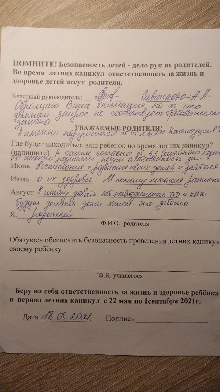 <<Добрый день! Скажите пожалуйста, сейчас родителей заставляют писать, где будут находиться дети в летние каникулы, вплоть до того, по какому адресу и какие числа. На какой закон мне упираться и как объяснить, что я такую информацию не дам?>>