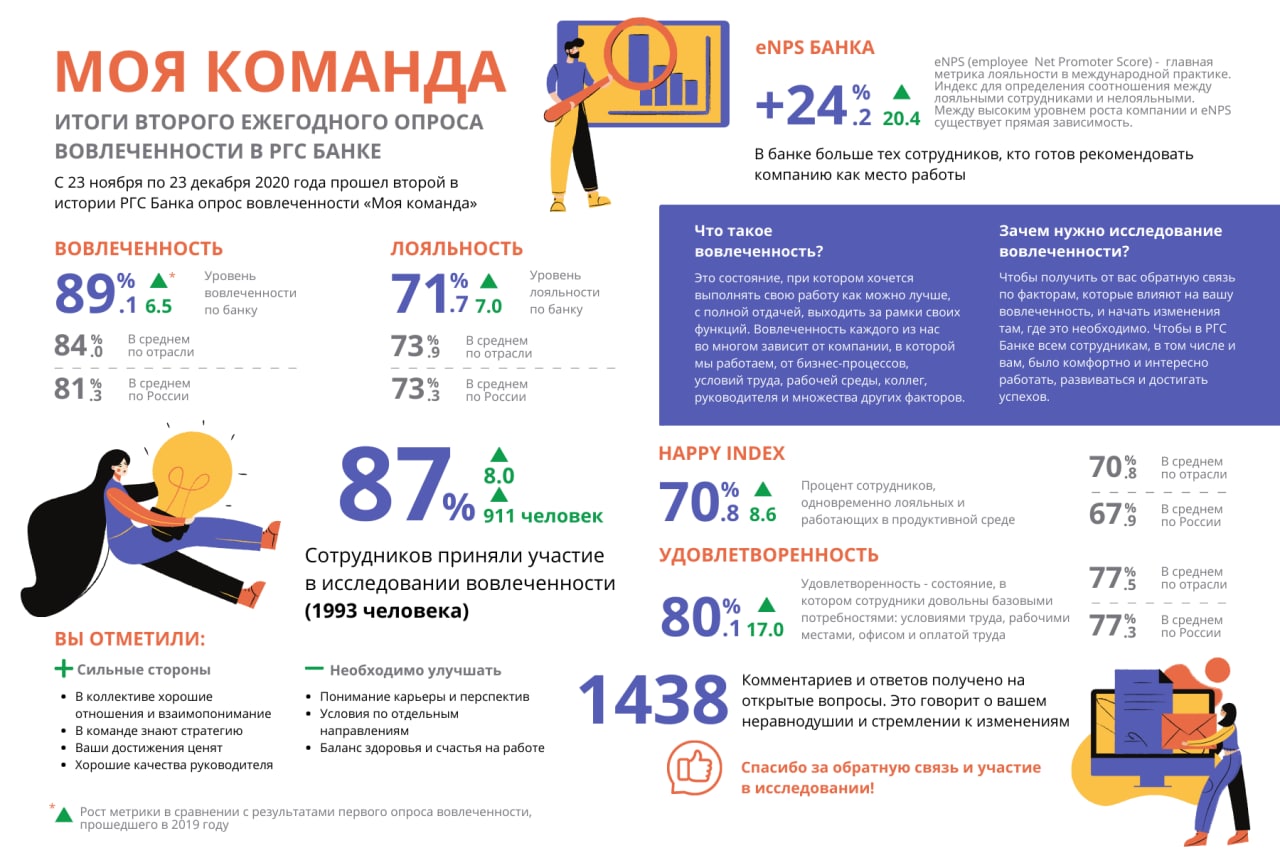 Коллеги, в нашем банке с 23 ноября по 23 декабря 2020 года прошло второе ежегодное исследование вовлеченности «Моя команда». Участниками исследования стали все текущие сотрудники, включая новичков, которые на момент старта опроса были в команде РГС Банка более 2-х месяцев. Благодарим всех, кто не остался в стороне и оставил честную обратную связь!
