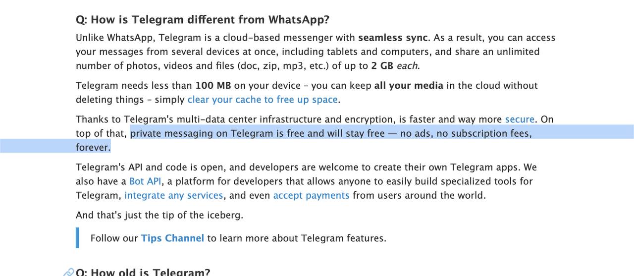 Telegram изменил описание на странице FAQ, в котором обещал, что навсегда останется бесплатным, без рекламы и подписок