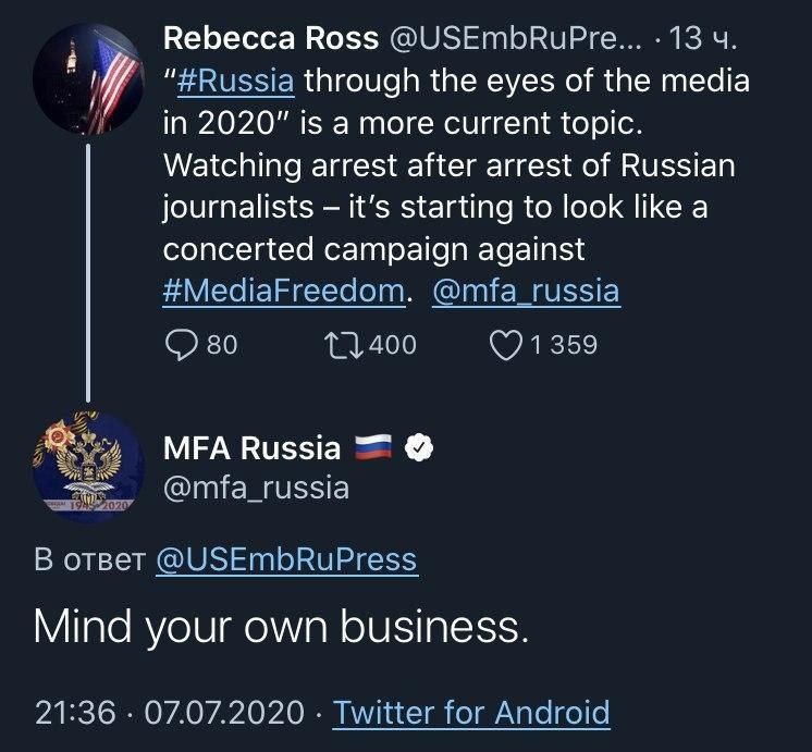 «Мы наблюдаем арест за арестом российских журналистов — это начинает напоминать скоординированную кампанию против свободы прессы», - написала Ребекка Росс в твиттере. На что последовал довольно грубый ответ от российского МИДа: «Не лезь не в свое дело».