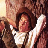 The red apple appears to be the acorn of a phallus. Is the Tree of Knowledge, then, being portrayed here as a media-dominated instrument of manipulation and control? That, at least, seems to be the artist's message.