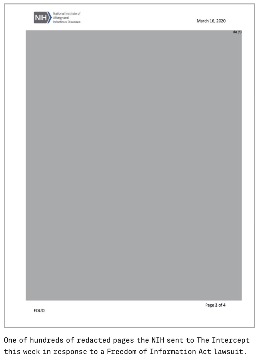 This week, in response to ongoing litigation over the release of public records related to coronavirus research funded by National Institutes of Health, the NIH sent The Intercept (magazine) 292 fully redacted pages rather than substantive material that they requested. These pages could have helped us to understand how the virus first came to infect humans. Below is one of the 292 pages that The Intercept received: