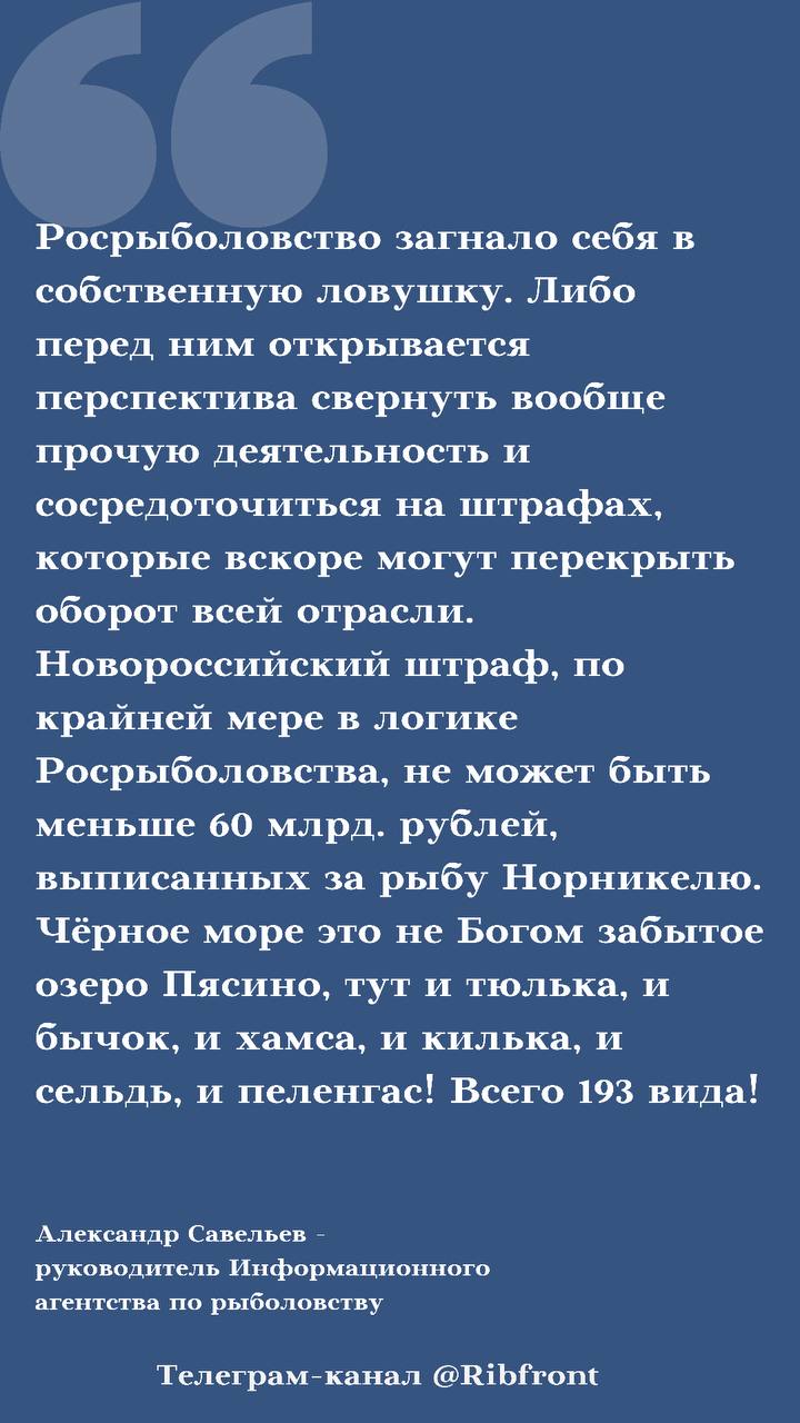 Новороссийский штраф, по крайней мере в логике Росрыболовства, не может быть меньше 60 млрд. рублей, выписанных за рыбу Норникелю».