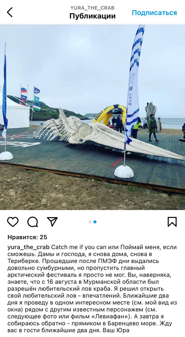 Камчатский краб Юрий - талисман, представлявший делегацию Мурманской области на прошедшем Петербургском экономическом форуме, зазывает всех на крабовое сафари на свою малую родину в Териберке: «Поймай меня, если сможешь!»