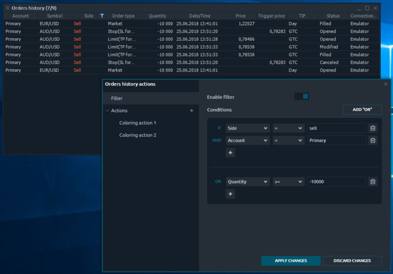 - Настройки действий (Setup Actions) (только для таких панелей, как Watchlist, Time & Sales, Positions, Working Orders etc.). Опция позволяет устанавливать алерты и расширенную фильтрацию для значений в таблицах.