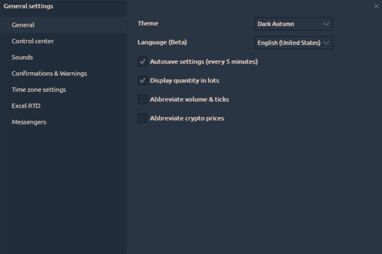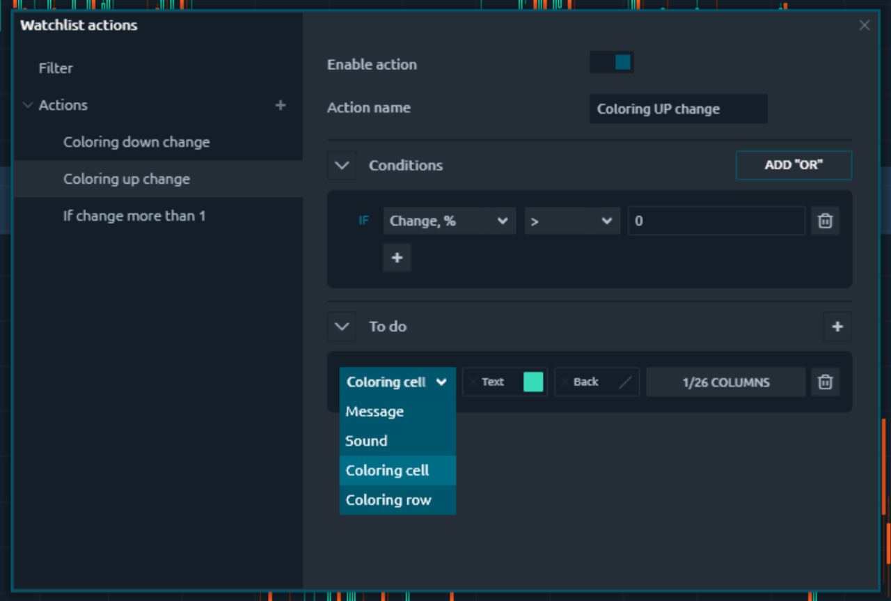 - Настройки действий (Setup Actions) (только для таких панелей, как Watchlist, Time & Sales, Positions, Working Orders etc.). Опция позволяет устанавливать алерты и расширенную фильтрацию для значений в таблицах.
