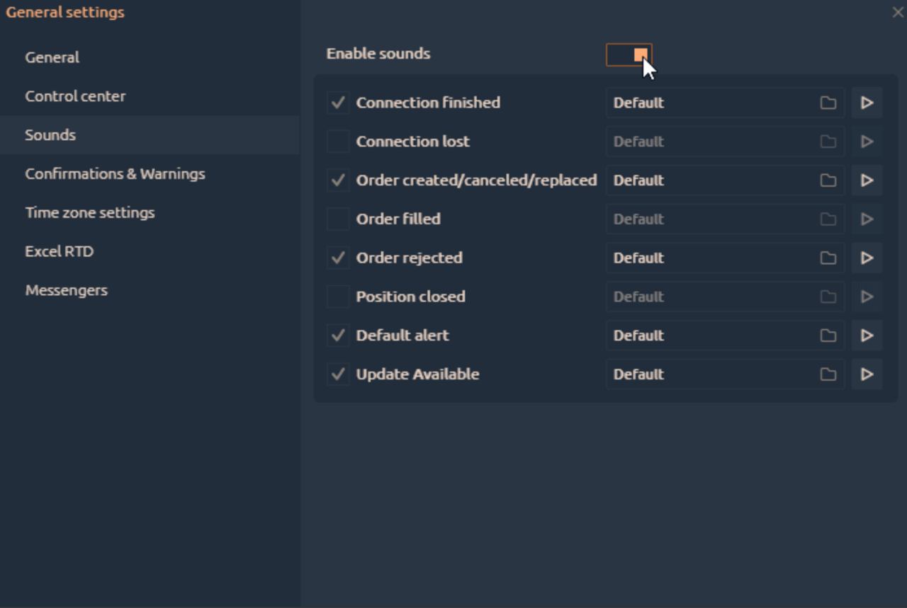 Функция Разрешить звуки (Enable sounds) включает или отключает все звуки в терминале в целом. Звуковые оповещения в ROE Maker можно настроить для наиболее распространенных групп действий. Это не окончательный список, и в дальнейшем может быть расширен или изменен.
