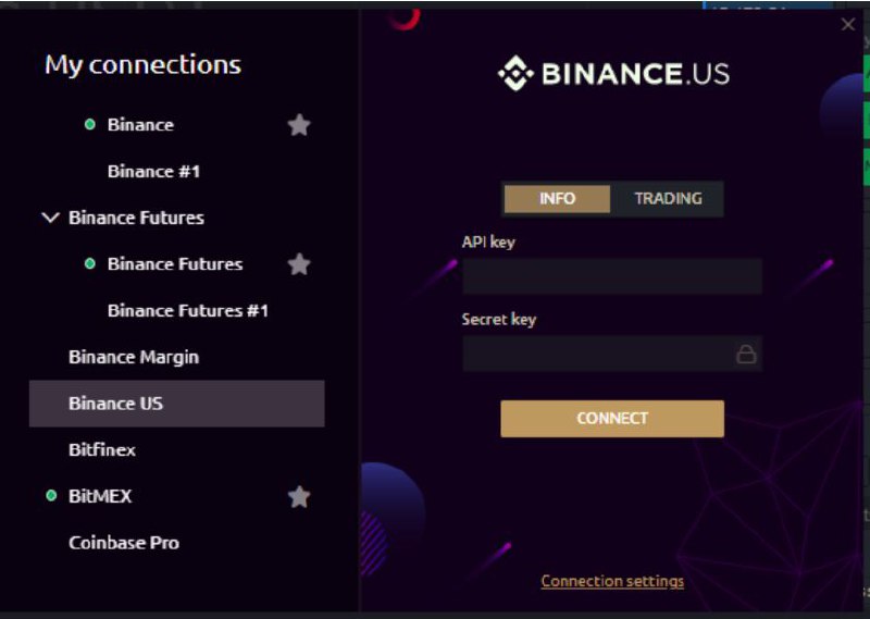 В ROE Maker вы можете выбрать из доступных бирж те, на которых вы уже торгуете, и подключиться к ним со своими учетными записями.